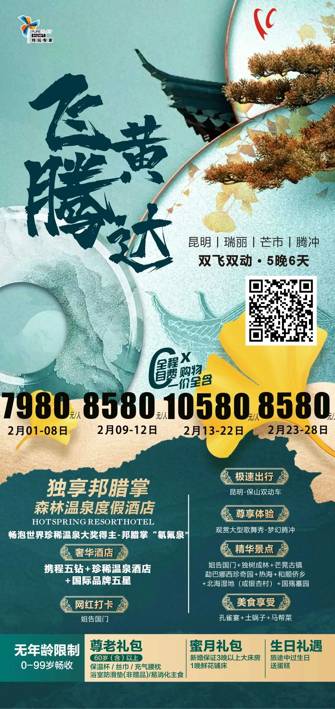📅日历 2月1日-8日 7980/人 2月9日-12日 8580/人 2月23日-22日 10580/人 2月23日-28日 8580/人 ⛳精华景点 姐告国门+独树成林+芒晃古镇勐巴娜西珍奇园+热海+和顺侨乡北海湿地(或银杏村)+国殇墓园 🏨奢华酒店 携程五钻+珍稀温泉酒店+国际品牌五星 🥗美食享受 孔雀宴+土锅子+马帮菜