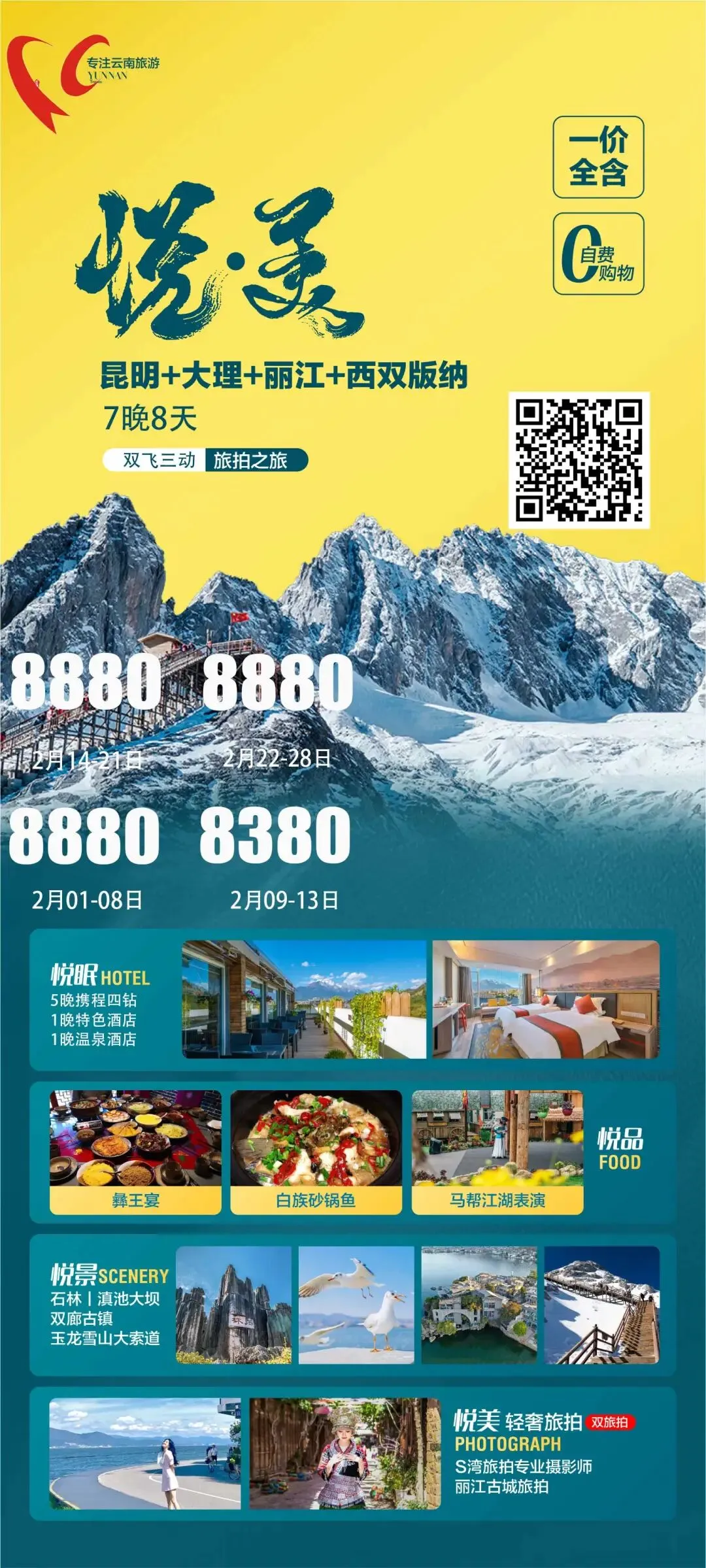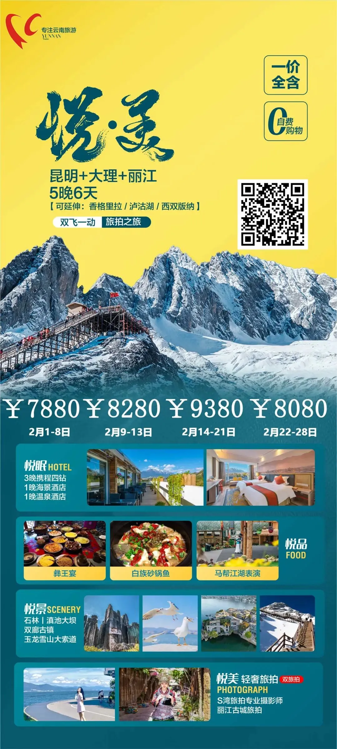 📅团期 2月1日-8日 8880/人 2月9-13日 8380/人 2月14日-21日 8880/人 2月22-28日 8880/人 🏢奢想住宿 5晚携程四钻 1晚特色酒店 1晚温泉酒店 🧆舌尖美食 彝王宴 白族砂锅鱼 马帮江湖表演 🥘精华景点石林|滇池大坝双廊古镇玉|龙雪山大索道