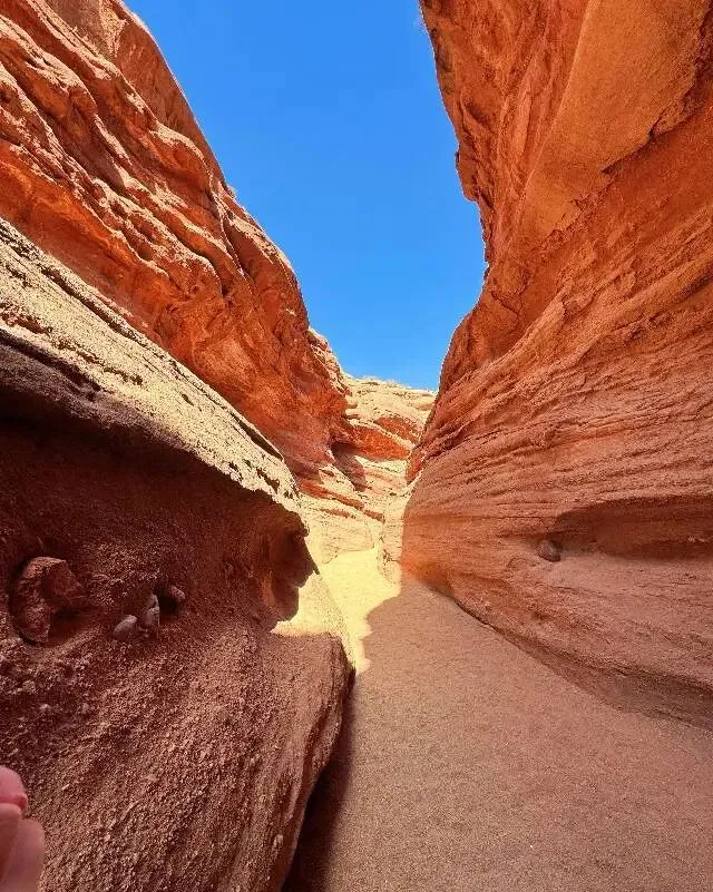 走了峡谷深处,手机信号都没有了,我拿着手机来回走动,换了好几个地方试,甚至把手机举过头顶,最后也只能死心。不过心想“这样才好,专心看风景,别老惦记着手机,放下手机,才能真正看清这儿的美。” 等真的走到目的地,看到眼前的景色,刚才一路上的所有惊险、疲惫和不安,好像一下子就烟消云散,全被直击心底的震撼取代。下午的阳光斜斜地照进峡谷,温柔又明亮,那些红褐色的岩石一层叠着一层,纹理清晰得仿佛能摸到,颜色从透亮的浅红,慢慢过渡到深沉的暗红,层次分明,跟有人特意用颜料精心晕染的似的,美得不像话。我拿着手机疯狂按快门,生怕错过任何一个角度,大叔就在旁边慢悠悠地劝:“别急,好风景还在后头呢,慢慢看,慢慢拍。”