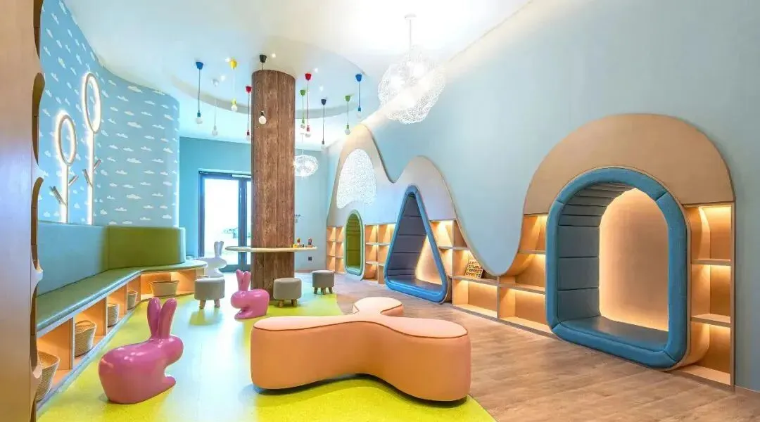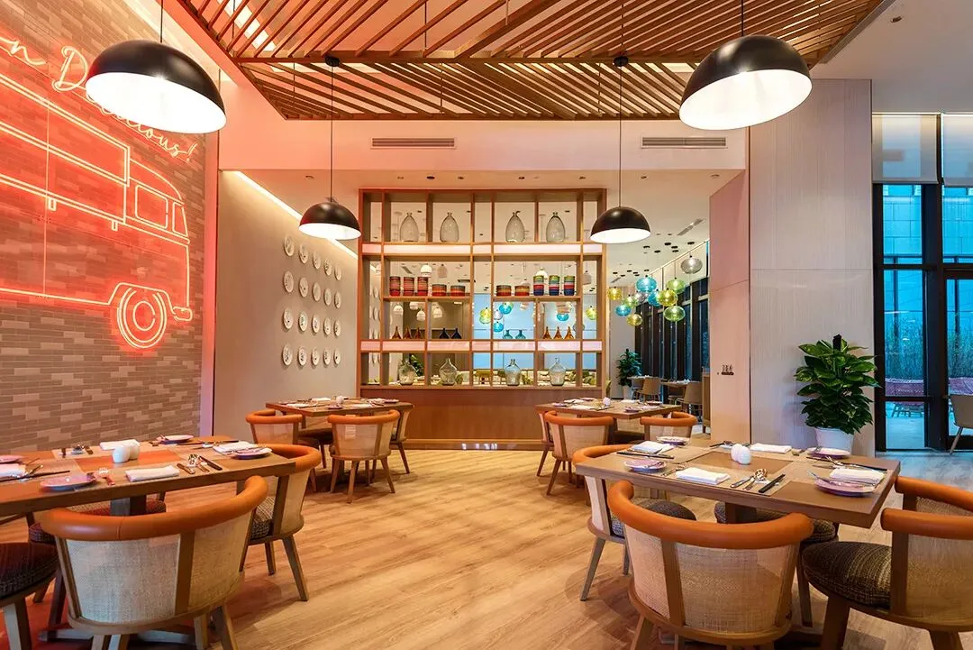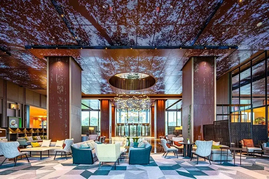 酒店本身是“洲际级稳妥保障”。作为茅山首个国际品牌酒店,HBA设计团队操刀的空间很懂度假感——大堂天使翅膀装置配EDM壁画,夜晚光影流转,既有江南山水的雅致,又不失现代感。