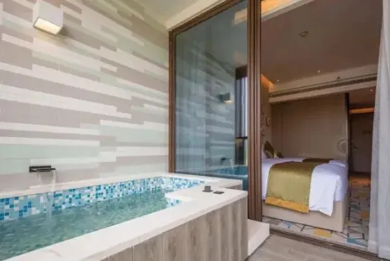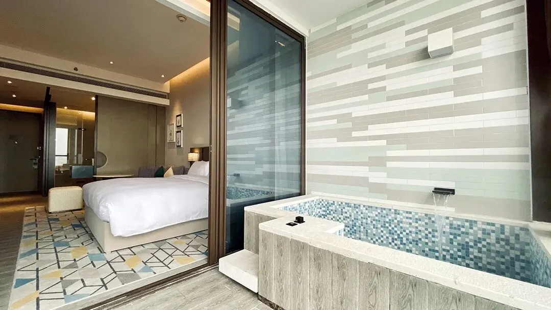 最得我心的是“一房一私汤”设计。45㎡起跳的客房,把温泉泡池嵌在景观阳台,拉上纱帘就是专属天地,边泡汤边看湖光山色,私密感直接拉满。床品是金可儿定制款,软硬适中,泡完汤可以倒头就睡。