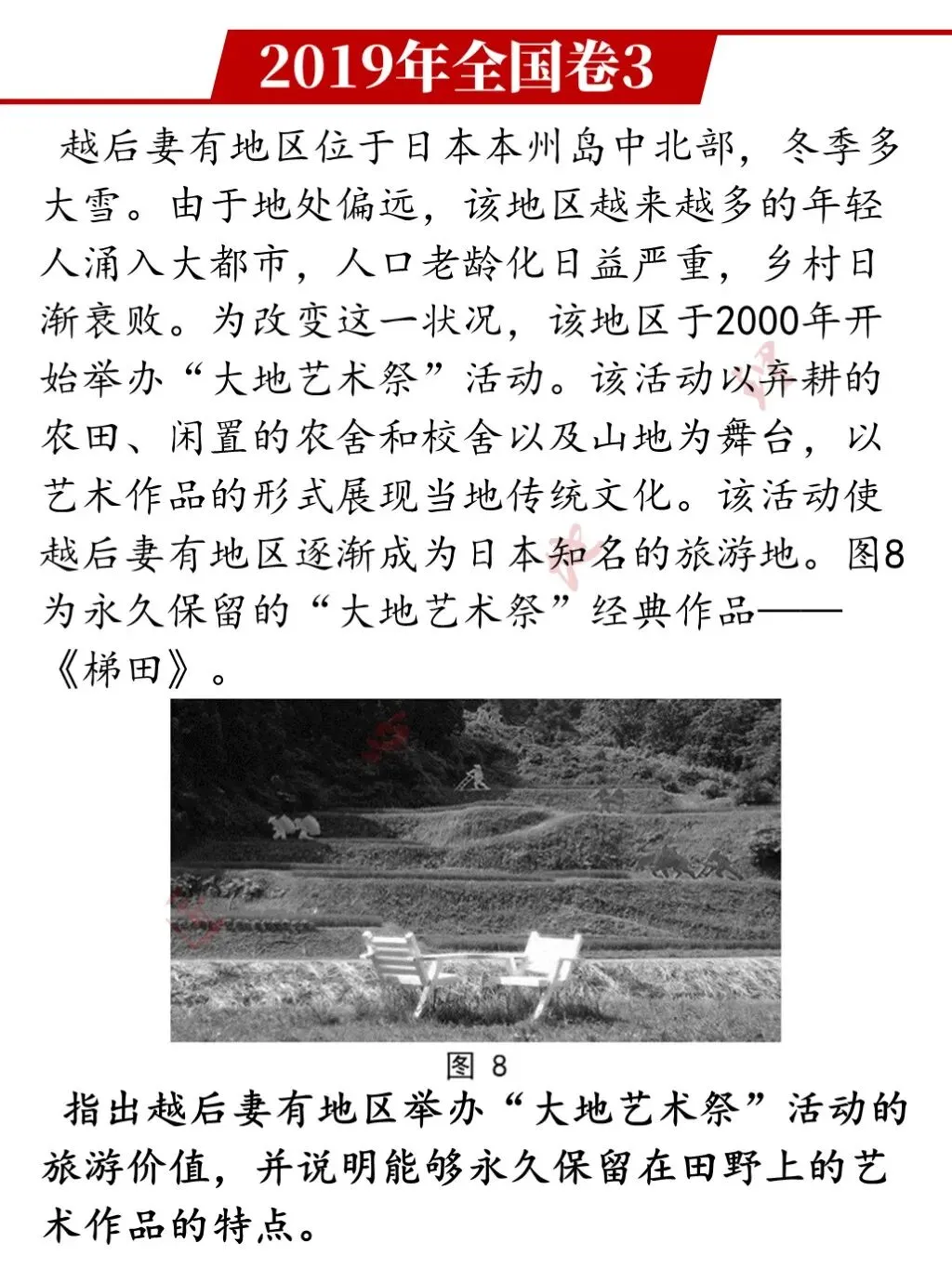参考答案:旅游价值:(“大地艺术祭”活动。该活动以弃耕的农田、闲置的农舍和校舍以及山地为舞台)展现人与自然和谐之美,具有审美价值;充分反映当地传统文化,具有浓郁的乡土文化价值;能带动旅游业发展,具有经济价值。(作者自己补充,合理性有待研究)