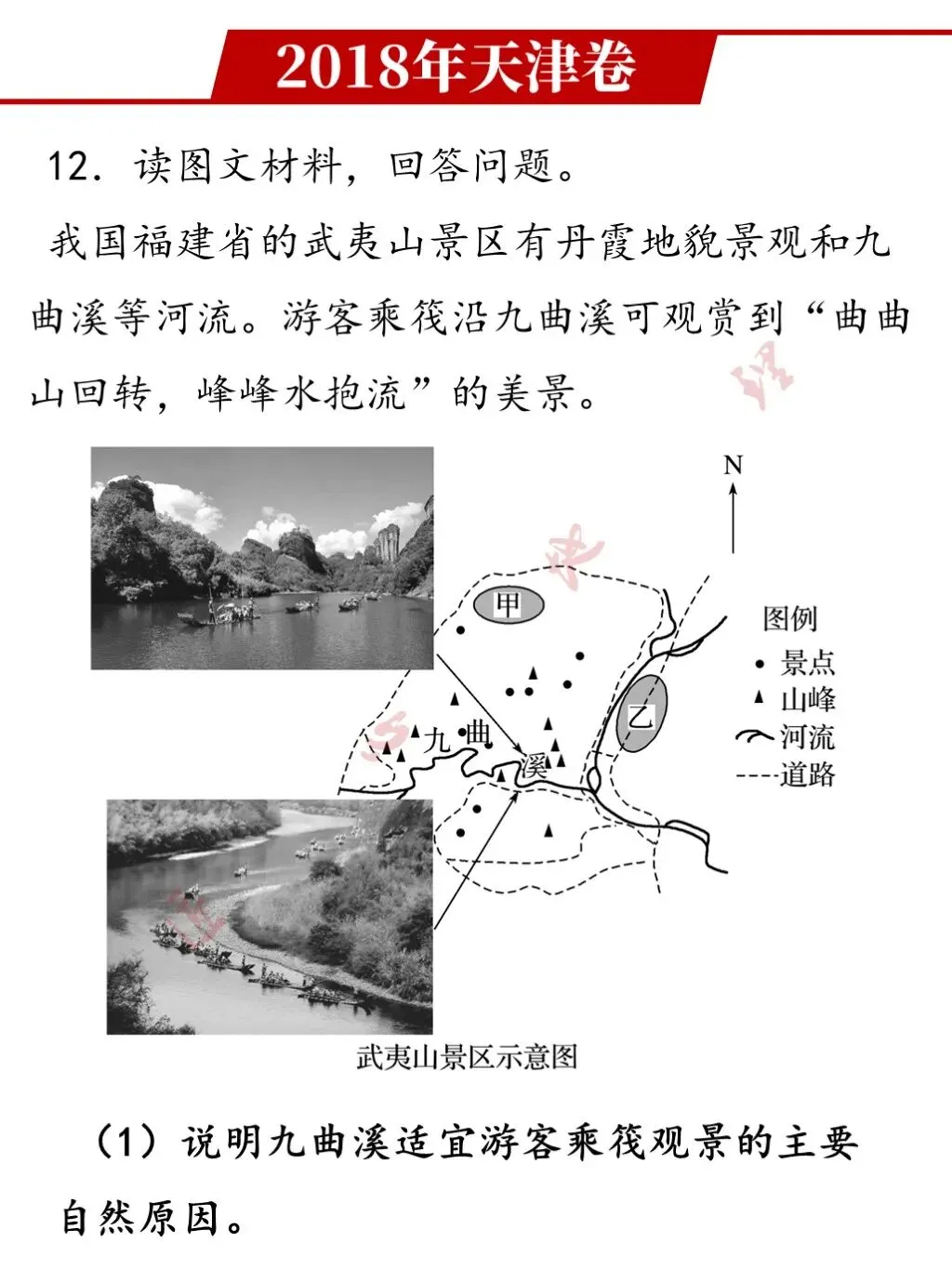 参考答案:地处亚热带季风气候区,河流水量较充足,无结冰期,全年适宜游客乘筏;河道弯曲(河流落差小),流速较缓,利于游客观景安全;两岸丹霞地貌景色秀美,对游客吸引力强。