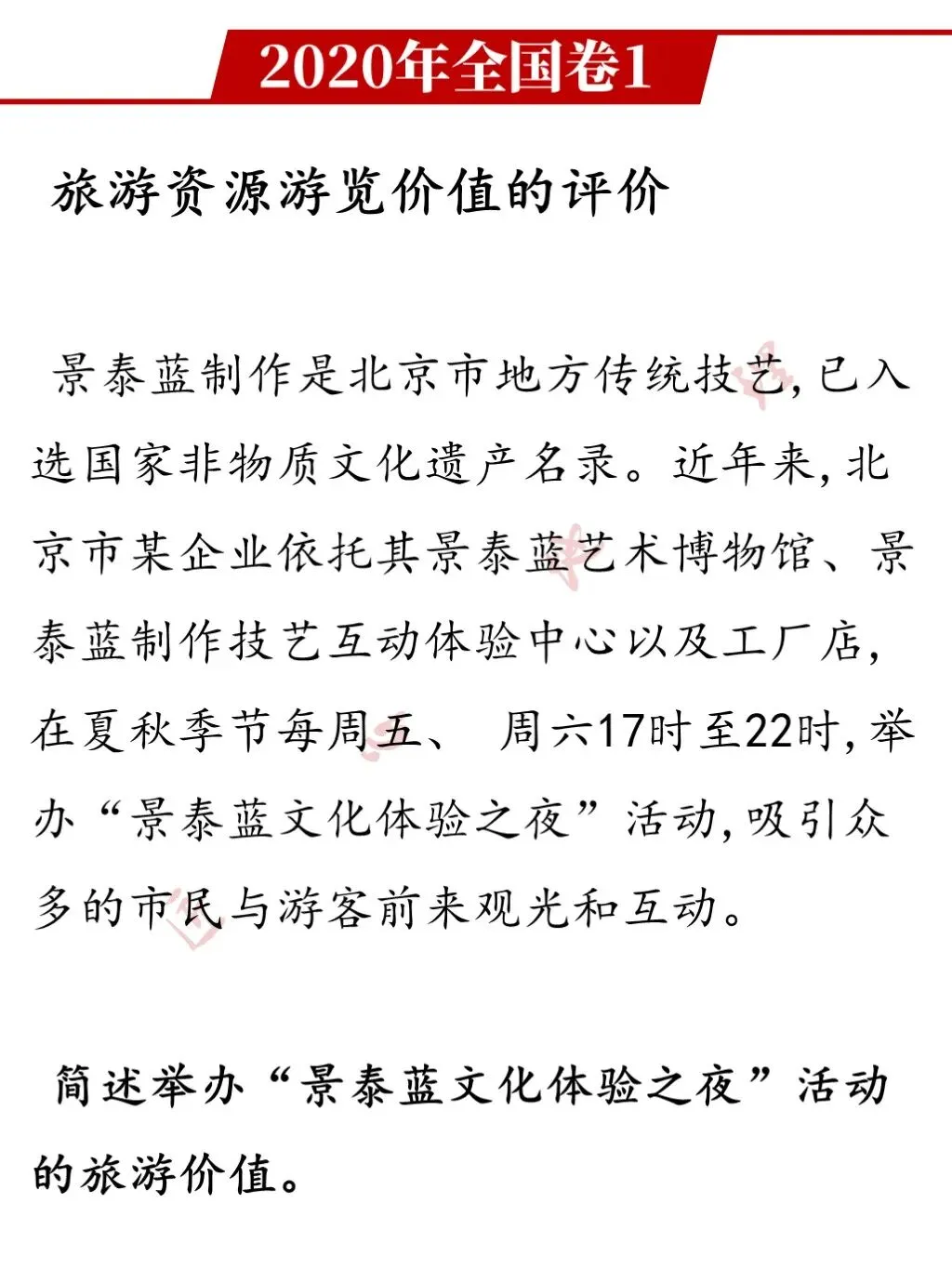 解析:旅游价值主要包括经济价值、历史文化价值、美学价值和科学价值。根据材料提示,举办“景泰蓝文化体验之夜”活动主要表现在经济价值和历史文化价值。在夏秋季节每周五、周六17时至22时,举办“景泰蓝文化体验之夜”活动,延长旅游活动时间,同时带动交通、餐饮、购物等相关产业的发展,提供更多的就业岗位,充分挖掘旅游的经济价值,增加旅游业收入;举办“景泰蓝文化体验之夜”活动,增强市民与游客对景泰蓝技艺的了解,丰富市民与游客的夜间文化生活,也有利于非物质文化遗产景泰蓝技艺的保护、传承与发展,体现了其历史文化价值。