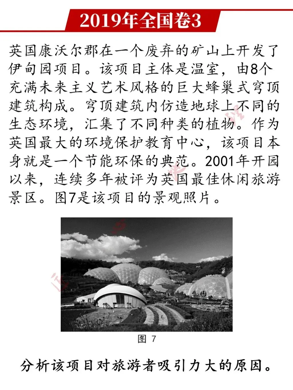 参考答案:在废弃矿山上兴建的伊甸园,改善了当地的生态环境,以丰富的植物资源和独特的艺术建筑风格为特色,为旅游者营造优美舒适的旅游环境;以环境保护和环境教育为主题,项目建设体现环保理念,观赏性强又能寓教于乐;(作为英国最大的环境保护教育中心,)规模大,建设时间较早,具有规模效应和品牌效应。