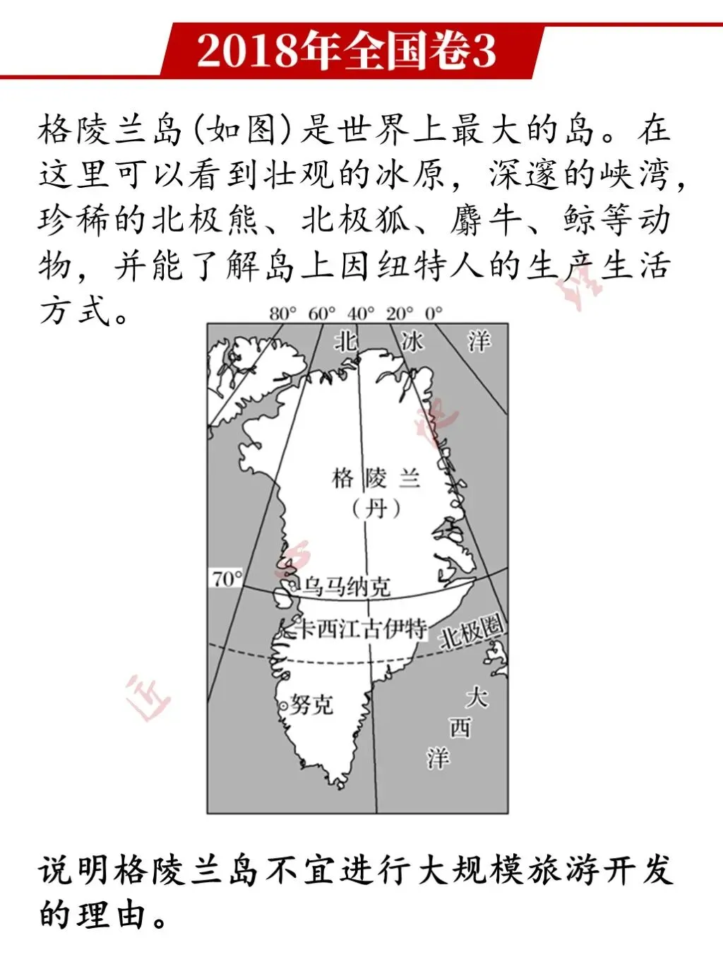 【写在最后】本题以高纬地区的格陵兰岛为背景考查旅游资源的开发条件评价,考查考生通过图文资料分析和解决地理问题的能力,而且采用的是逆向思维考查。