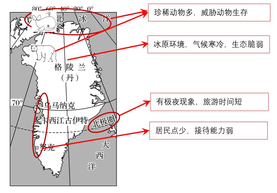 参考答案:地处高纬,生态脆弱,一旦破坏,很难恢复,直接威胁珍稀动物的生存;适宜旅游的时间短,旅游设施维护费用高;格陵兰岛的居民少且分散,大多局限于沿海地区的小居民点,旅游接待能力有限;外来文化对当地传统文化造成冲击,干扰因纽特人独特的生产生活方式。
