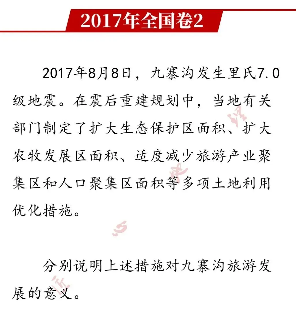 【写在最后】本题选取九寨沟国家级自然保护区为载体,考查旅游资源开发、旅游环境保护、旅游安全以及区域可持续发展等相关知识和相关原理,同时考查考生迁移运用相关原理分析地理问题并解决实际问题的能力,避免套用答题模板。