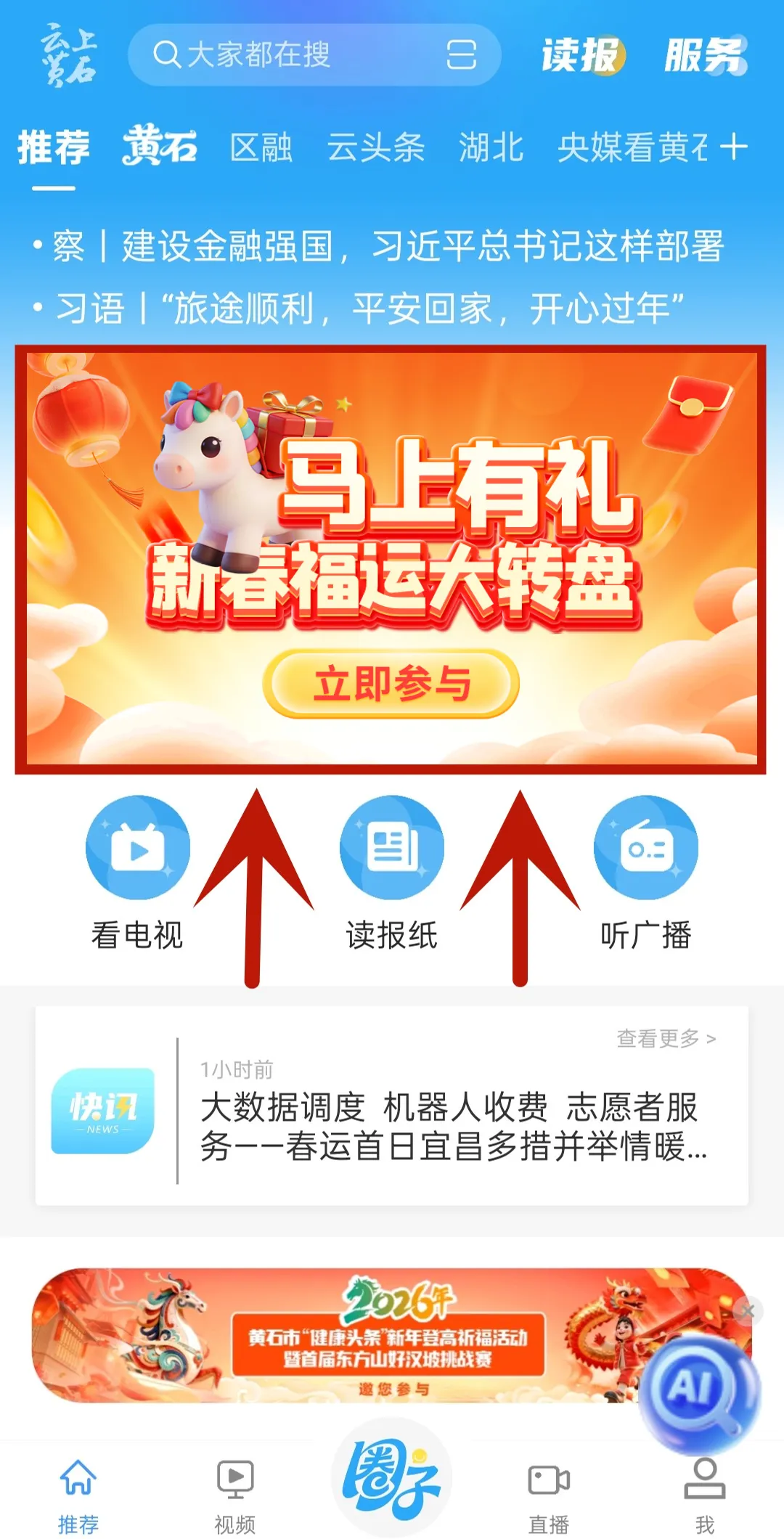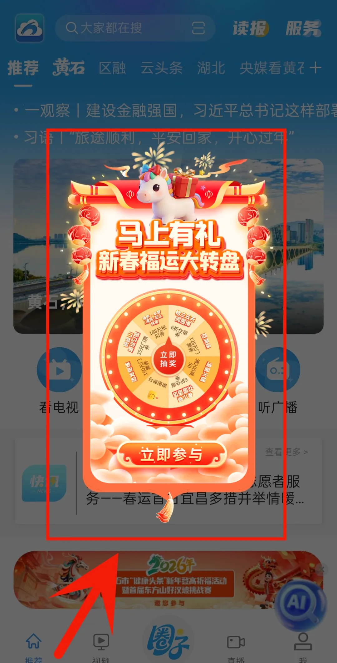 👉 进入客户端首页,找到“马上有礼”新春福运大转盘入口