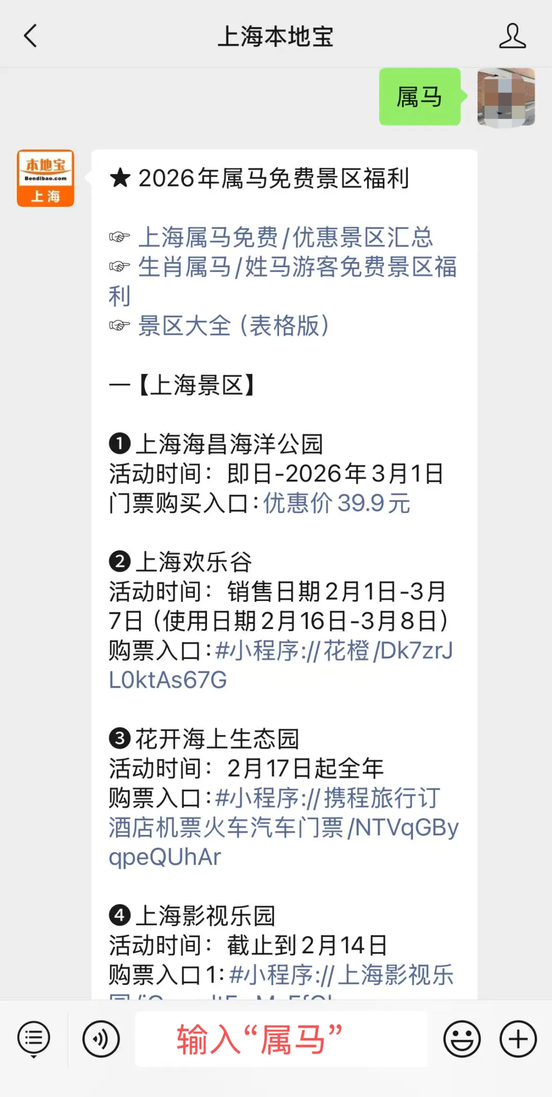 扫描下方二维码,关注上海本地宝,后台对话框私信回复【属马】,查看全国属马免费/优惠景区活动信息(持续更新中)