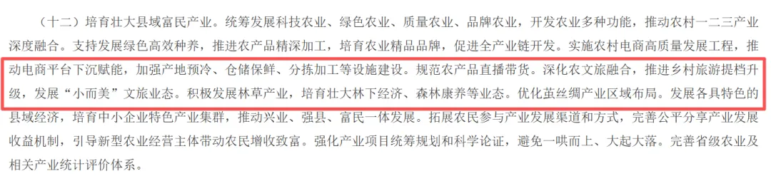 (十二)培育壮大县域富民产业。统筹发展科技农业、绿色农业、质量农业、品牌农业,开发农业多种功能,推动农村一二三产业深度融合。支持发展绿色高效种养,推进农产品精深加工,培育农业精品品牌,促进全产业链开发。实施农村电商高质量发展工程,推动电商平台下沉赋能,加强产地预冷、仓储保鲜、分拣加工等设施建设。规范农产品直播带货。深化农文旅融合,推进乡村旅游提档升级,发展“小而美”文旅业态。积极发展林草产业,培育壮大林下经济、森林康养等业态。优化茧丝绸产业区域布局。发展各具特色的县域经济,培育中小企业特色产业集群,推动兴业、强县、富民一体发展。拓展农民参与产业发展渠道和方式,完善公平分享产业发展收益机制,引导新型农业经营主体带动农民增收致富。强化产业项目统筹规划和科学论证,避免一哄而上、大起大落。完善省级农业及相关产业统计评价体系。
