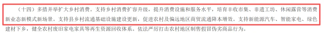 (十四)多措并举扩大乡村消费。支持乡村消费扩容升级,提升消费设施和服务水平,培育丰收市集、非遗工坊、休闲露营等消费新业态新模式新场景。支持县乡村流通基础设施建设更新,促进农村及偏远地区商贸流通降本增效。支持新能源汽车、智能家电、绿色建材下乡,健全农村废旧家电家具等再生资源回收体系。依法严厉打击农村地区制售假冒伪劣商品行为。