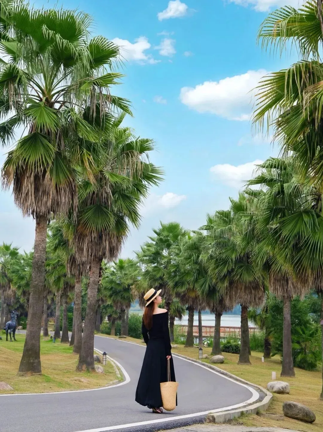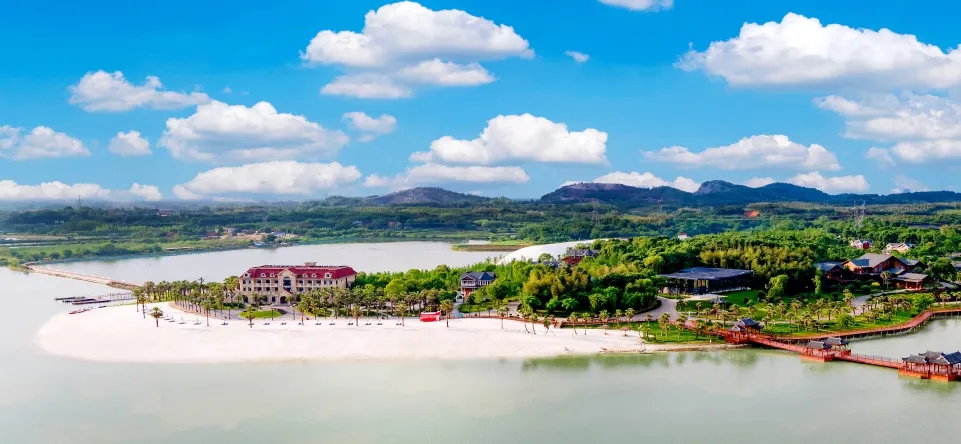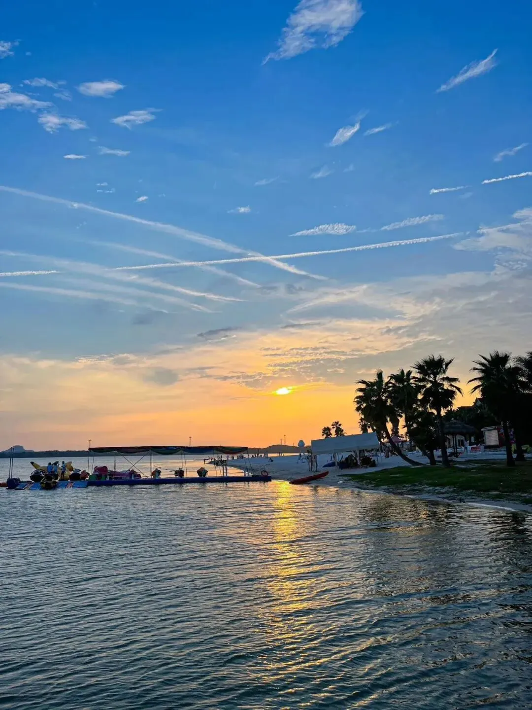 银白色的银沙滩上棕榈树摇曳,躺椅和帆布阳伞错落分布,远眺一望无际的湖岸线与蓝天白云;隔湖相望的金沙滩宛如 “黄金海岸”,与银沙滩遥相呼应,共同勾勒出浪漫的南国风情画卷。