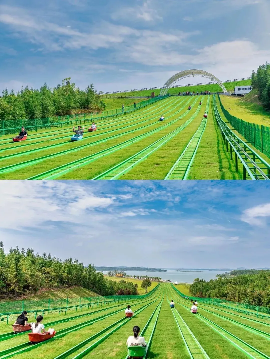 华中地区最长的滑草道超吸睛(300多米!),从顶端飞驰而下,感受清风拂面、绿意掠眼的极致快感;油桶小奔奔迷你小火车童趣满满,坐着它穿梭在草原清风里,以最悠闲的视角欣赏沿途风光。