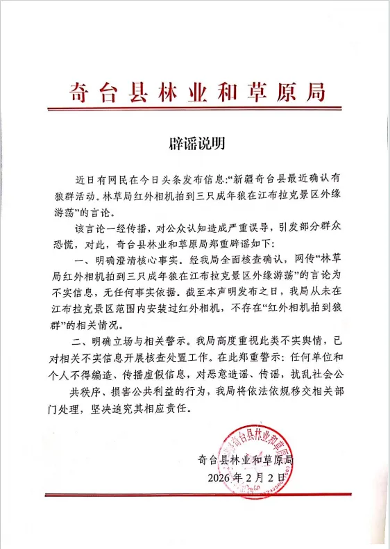 经奇台县林业和草原局核实,网传信息系谣言。截至本声明发布之日,我局从未在江布拉克景区范围内安装过红外相机,不存在“红外相机拍到狼群”的相关情况。请广大网友提高警惕,切勿相信网络传言。