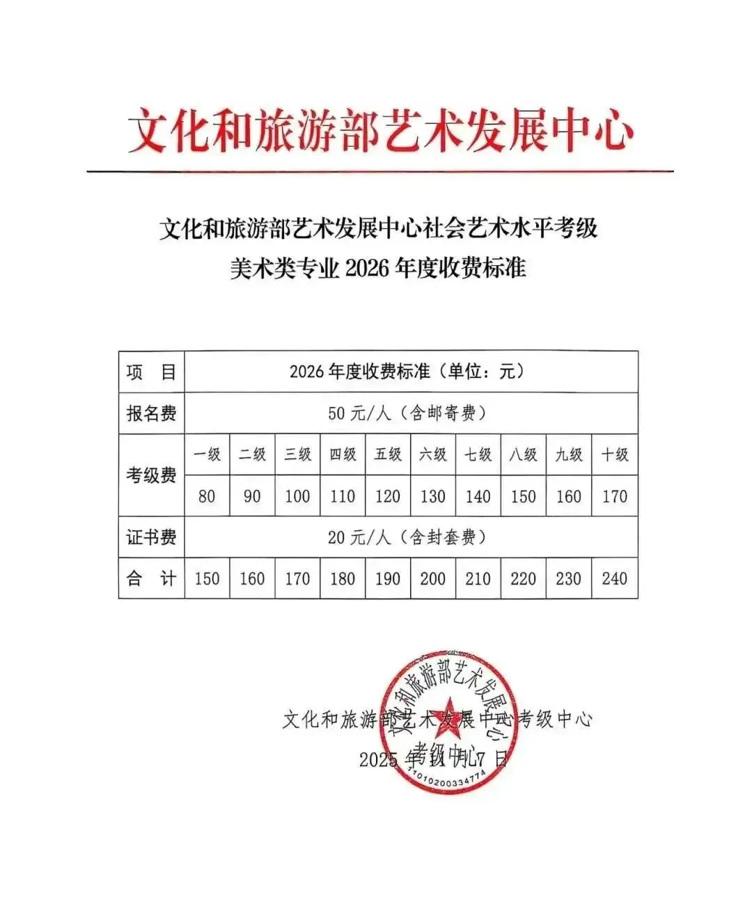 美术考级收费标准由文化和旅游部艺术发展中心统一制定和调整,任何承办单位及其他机构无权调整和变更。