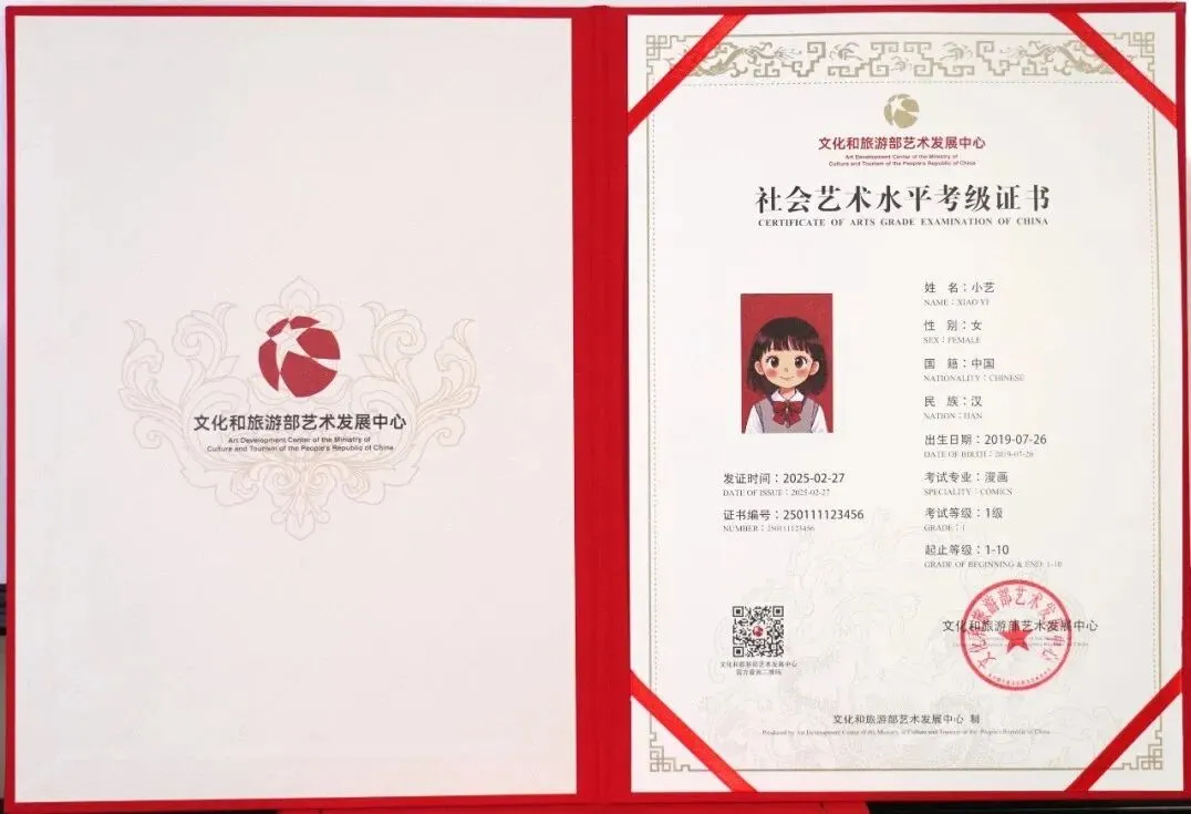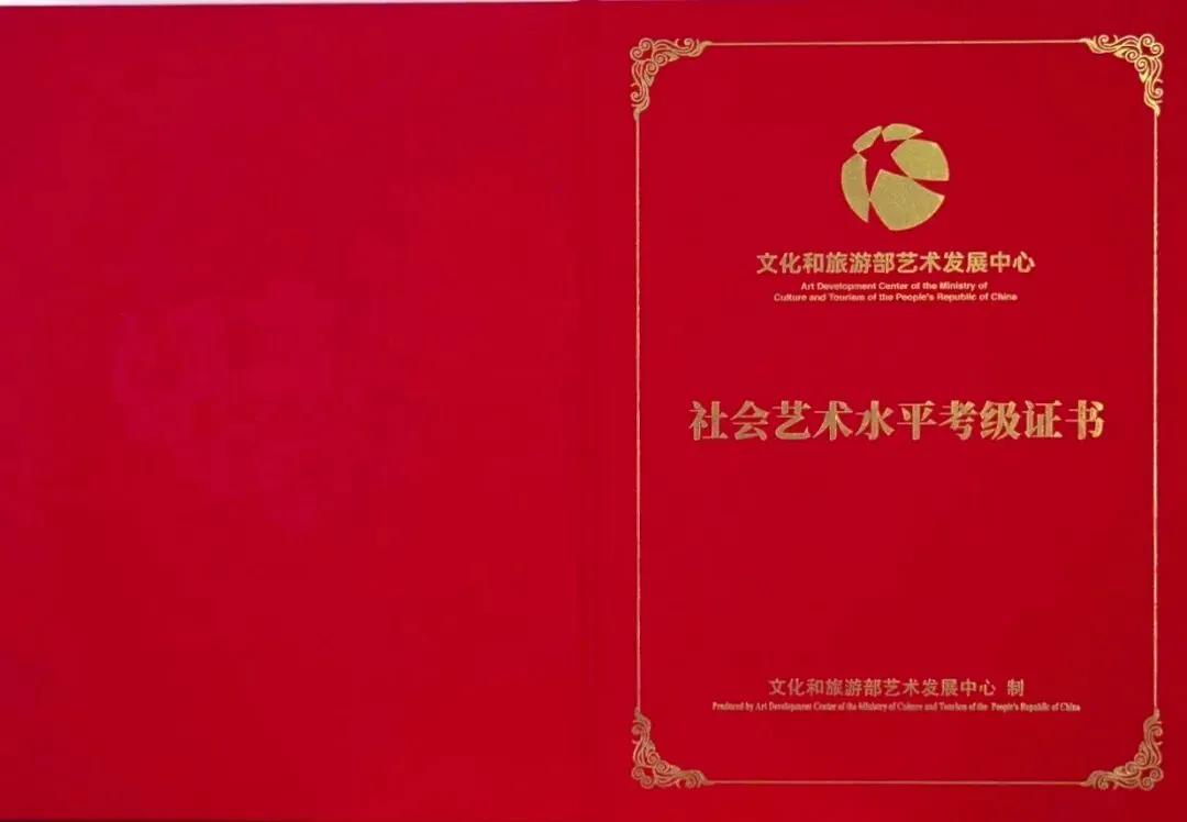 考级通过者, 文化和旅游部艺术发展中心为其颁发《社会艺术水平考级证书》。