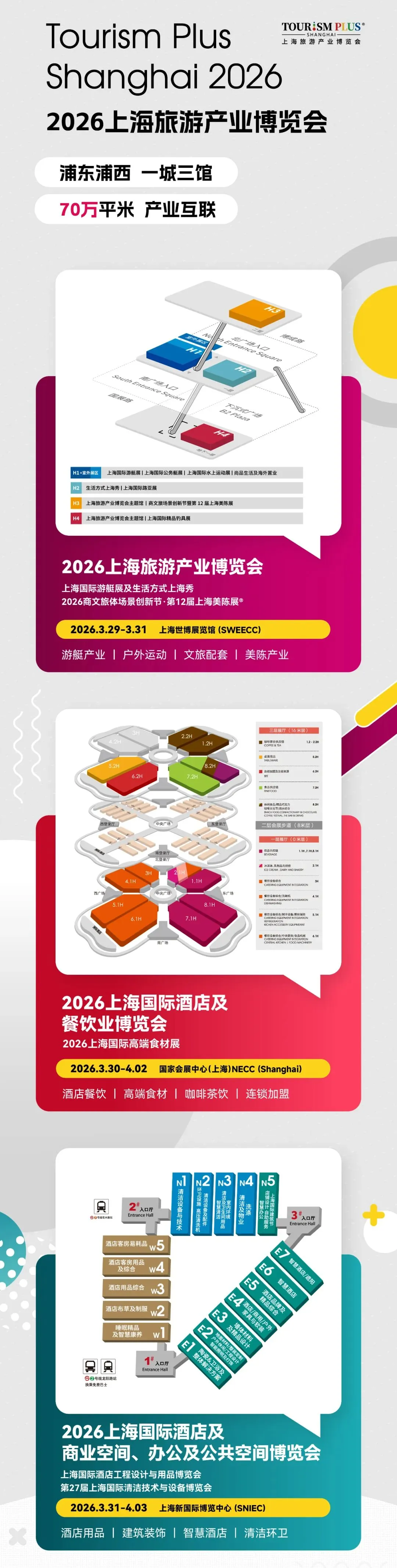 2026年3月29日-4月3日,浦东浦西,一城三馆,上海旅游产业博览会将以70万平方米的展览规模,预计迎来45万海内外观众,展出覆盖全产业链的数以十万计的新品,通过产业互联,助推“旅游+百业”及“百业+旅游”的高质量发展!
