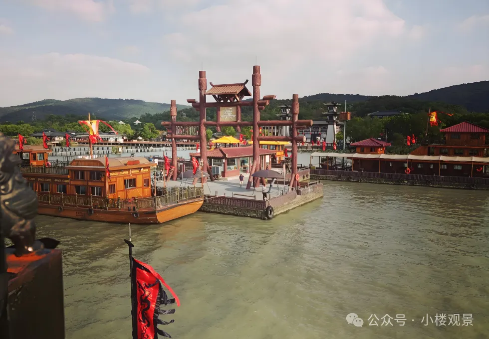 三国城门楼高大、威猛,旌旗随风飘展,配以广场上天禄和辟邪两尊神兽,更显得门楼的庄严与肃穆,这里是《三国演义》中诸葛亮智设空城计,退了司马懿几十万大军的拍摄地。三座辕门掩映下的曹军水旱寨,规模庞大,由曹操点将台、辕门、四座敌楼和楼船组成,是《三国演义》中“火烧赤壁”、“横槊赋诗”、“草船借箭”等戏的拍摄所在。曹操点将台两侧,战鼓矗立,依稀可见一代枭雄曹公当年的威仪。抚辕而立,又令人遥想三国纷纭时代那无数英雄豪杰,终归在翻涌浪花的滚滚长江之中化为了中国历史上的一个个人物,为后世万代所景仰。