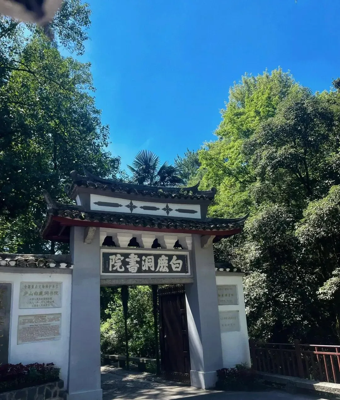 白鹿洞书院在山脚下,唐时李渤养白鹿读书,宋代朱熹整过学规,墙上现在还挂着“以孝治天下”的匾。