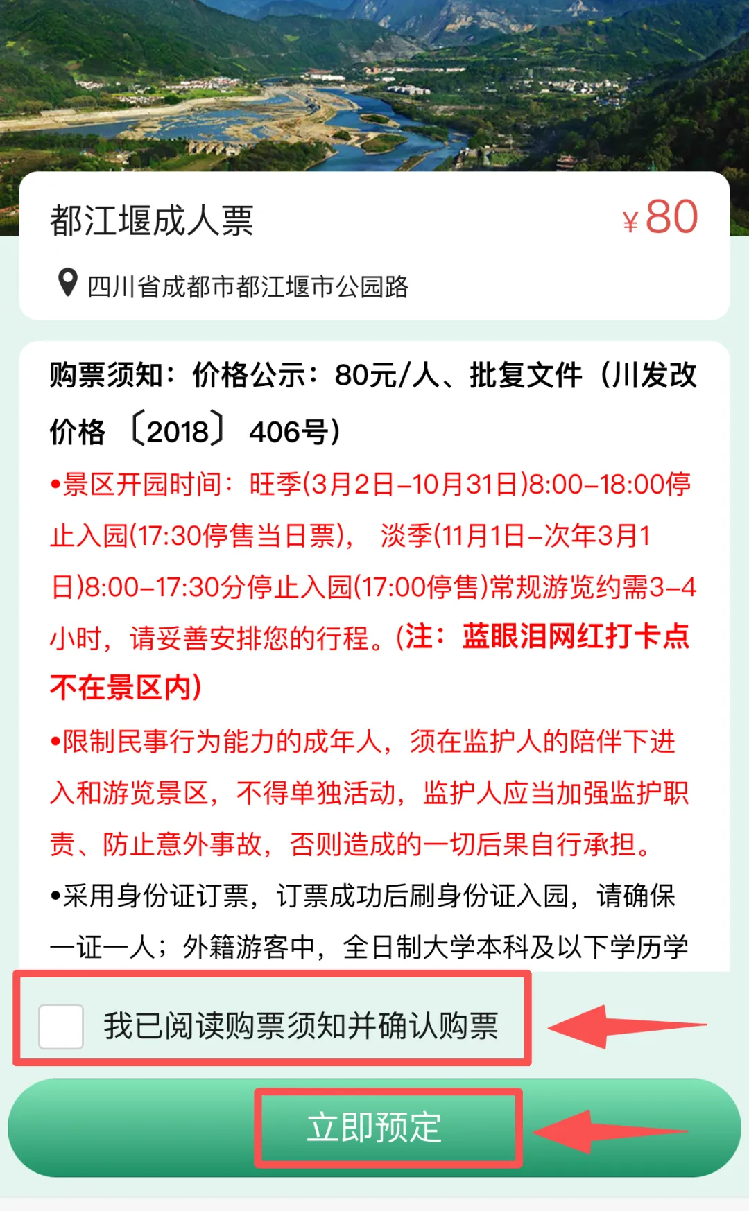 ④仔细阅读购票须知,确认无误后,勾选“我已阅读购票须知并确认购票”,然后点击“立即预定“;