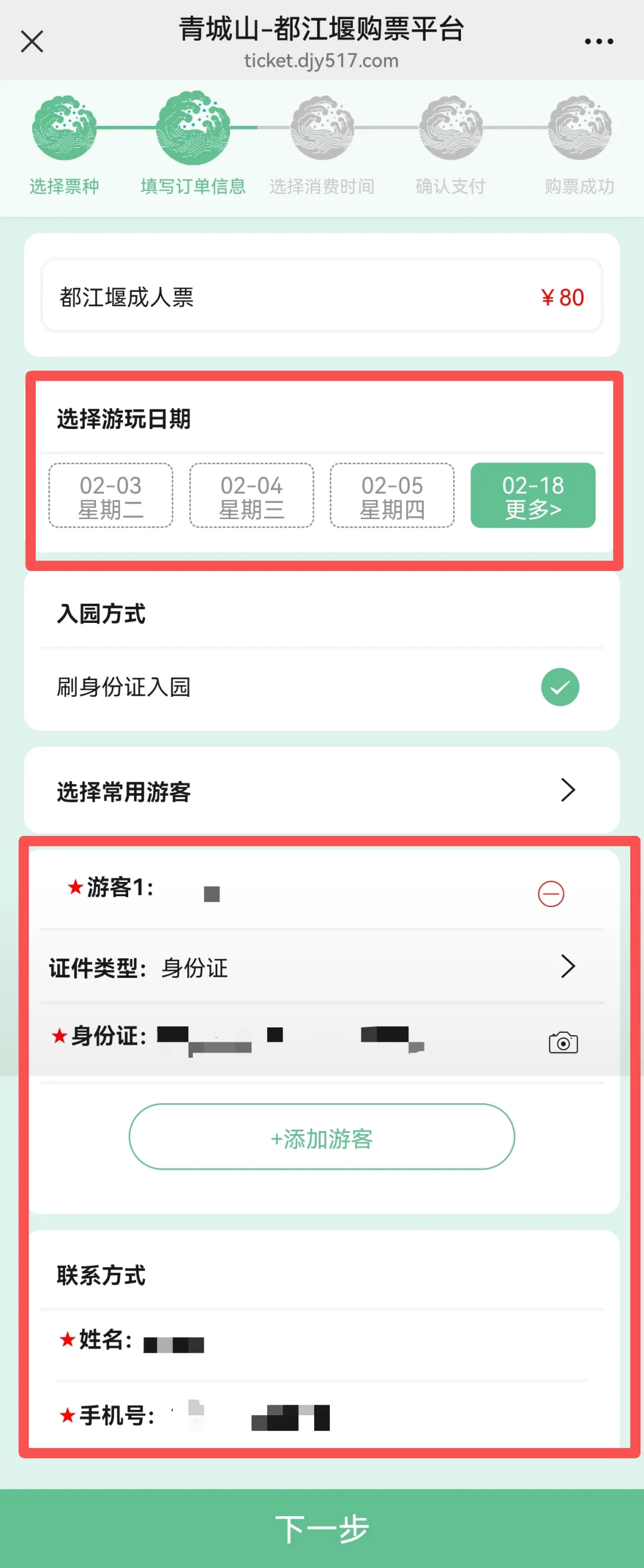 ⑤选择游玩日期并准确无误的填写游客信息及联系方式;