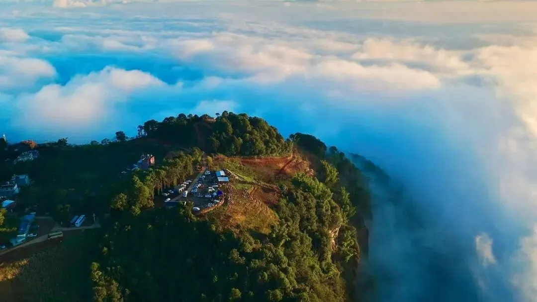 在酒店观景台,看云海翻涌、旭日东升,金光洒满群山,宛若仙境,寓意新年光明辉煌。