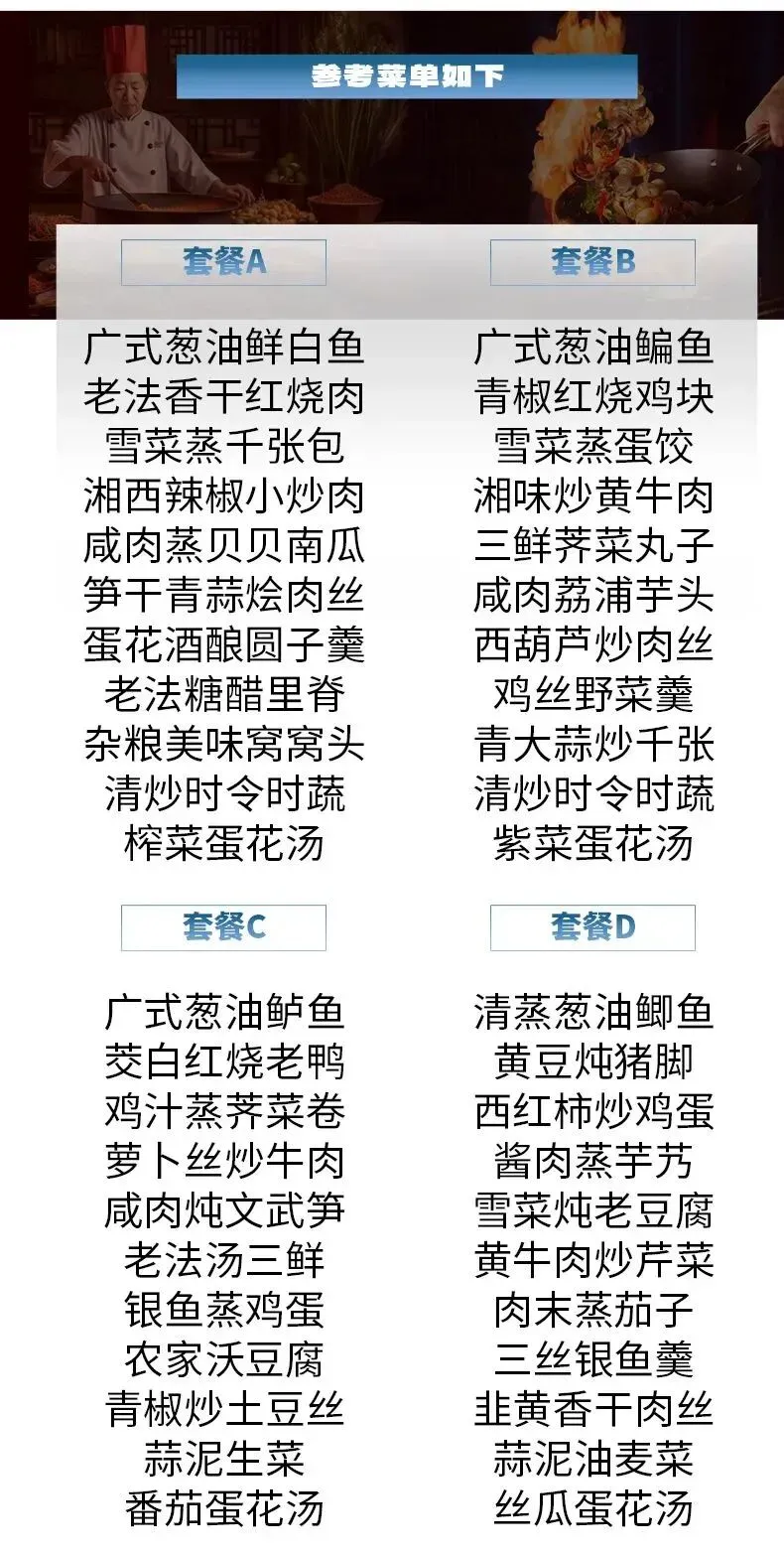 以上菜单为10人参考菜单,根据人数加减菜品,根据季节或时令会有所变动,但不会降低标准。