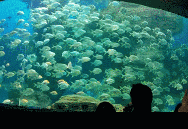 在海洋剧场13米高的巨型水族展缸前