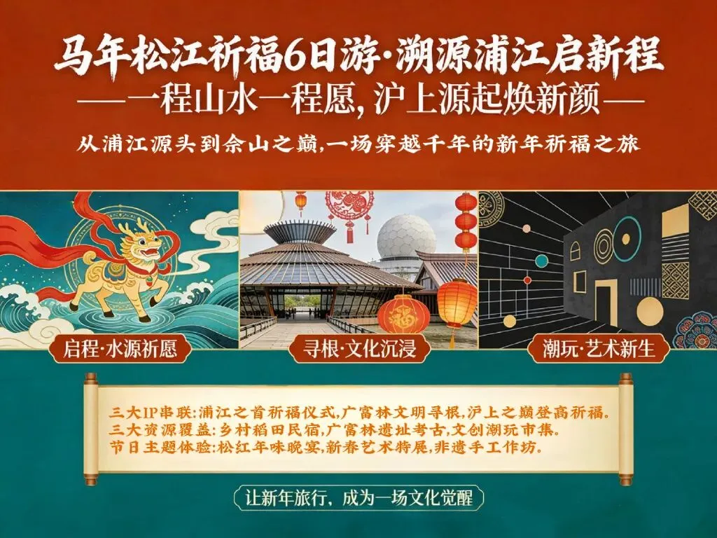 本次行程不仅深度融合松江“乡村、文化、自然、文创”四大核心资源,还独创性串联松江三大地理文化核心IP:“沪上源起”浦江之首、“上海之根”广富林、“沪上之巅”佘山。从浦江源头的祈愿启程到佘山的山巅祈福,从广富林的文化寻根到云堡未来市的艺术潮玩,兼顾传统与新潮。节日主题活动贯穿全程,非遗体验、美食盛宴、艺术展览层层递进,让游客在新春氛围中全方位感受松江的独特魅力。