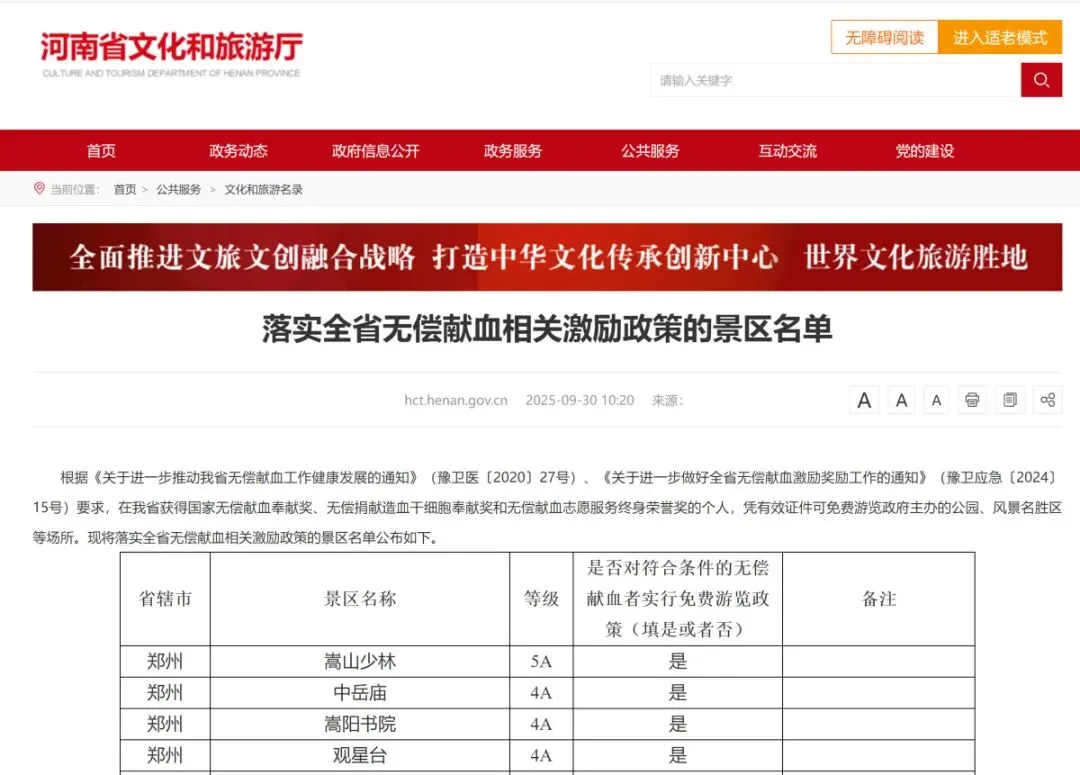 河南省文化和旅游厅官网发布落实全省无偿献血相关激励政策的景区名单