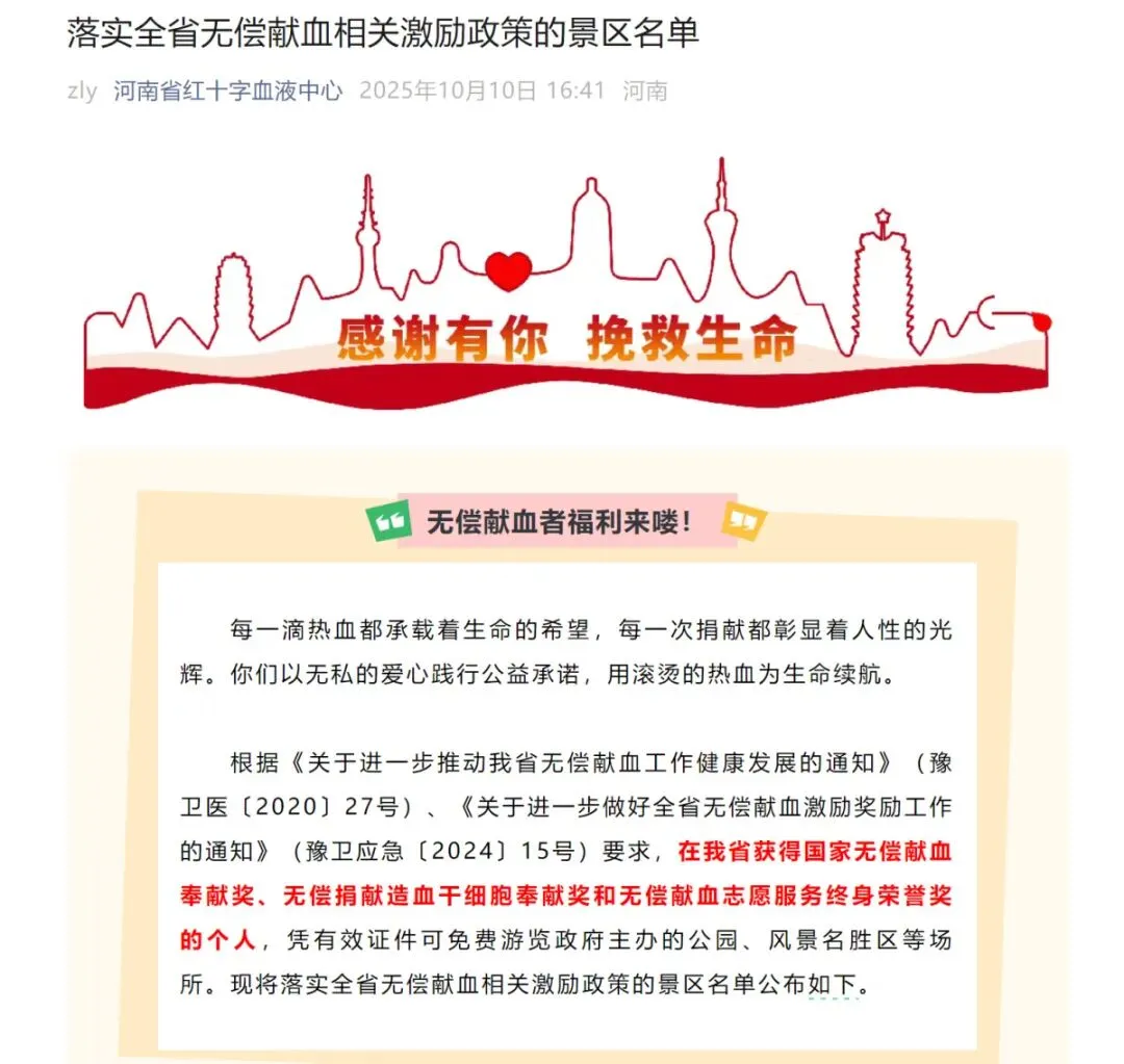 继河南省文化和旅游厅9月30日发布“落实全省无偿献血相关激励政策的景区名单”后,10月10日,河南省红十字血液中心转发相关内容,使河南省符合相关条件的无偿献血者特别“福利”为更多人所知。