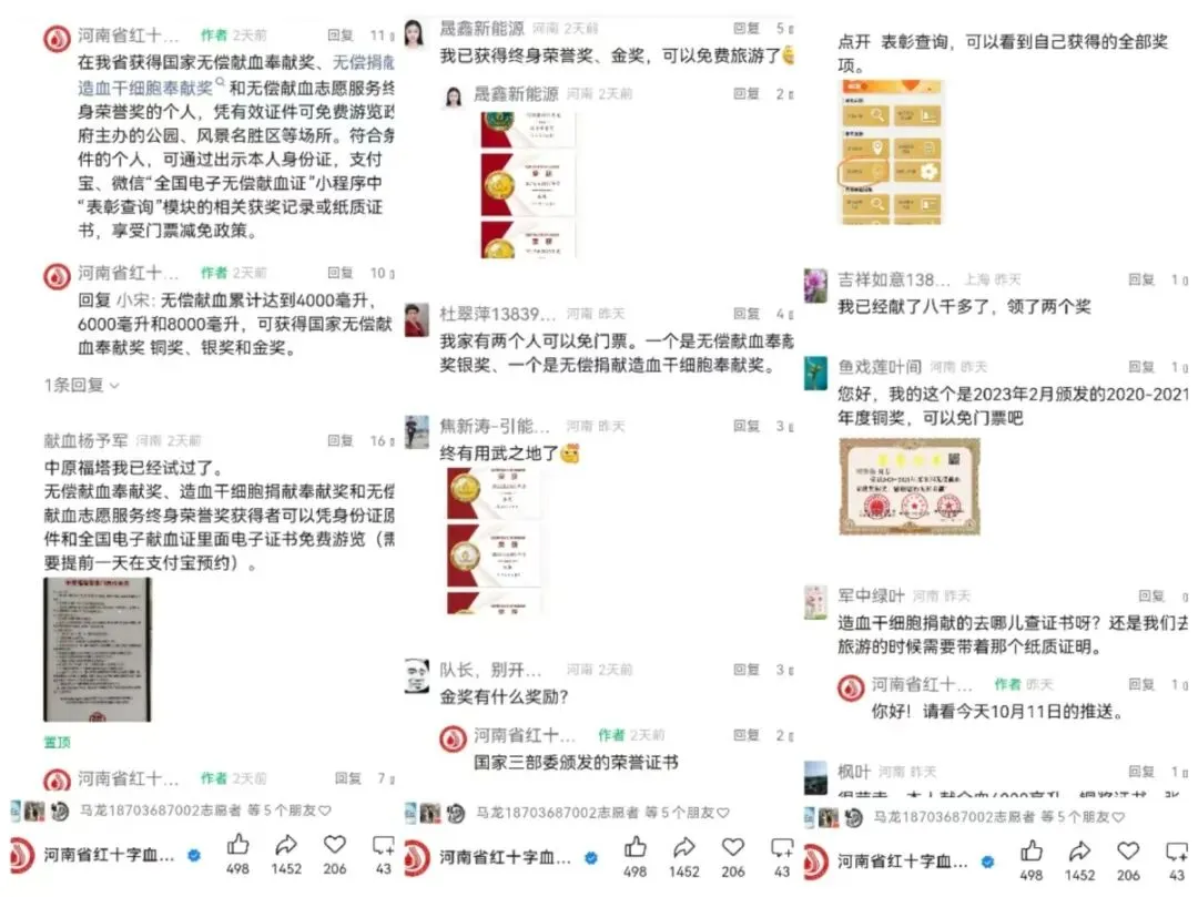 不久后,三门峡、新乡等地也下发通知,为符合条件的无偿献血者送上免收景区首道门票等福利。
