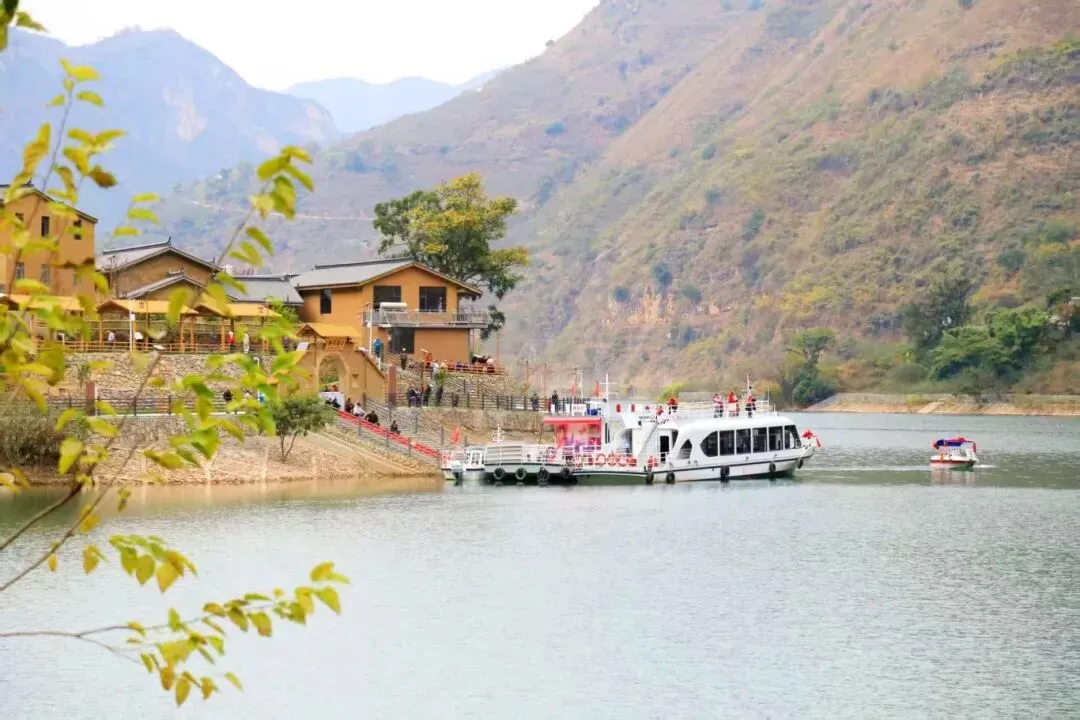 织女湖的年,既有欢乐活动,更有山水馈赠的静谧惬意。冬日的织女湖宛如一块巨大的翡翠,镶嵌在群山之间,织女湖的湖面清澈见底,倒映着蓝天、白云、绿树与岸边错落有致的房舍。远处的峡谷壁立千仞,近处的湖面碧波荡漾,乘观光船泛游湖上,冬日的阳光洒在水面,波光粼粼,两岸群山或披墨戴绿,或斑斑露褐,山坡上松翠柏绿、杂草金黄、野菊绽放,宛如一幅天然的山水画卷。若是偏爱宁静,可沿着林间小径漫步,偶有天光穿透树叶洒落,微风拂过,带来山间的清新气息,找一处湖畔石凳坐下,享受无人打扰的宁静时光,感受“人在画中行,心随云水游”的惬意。