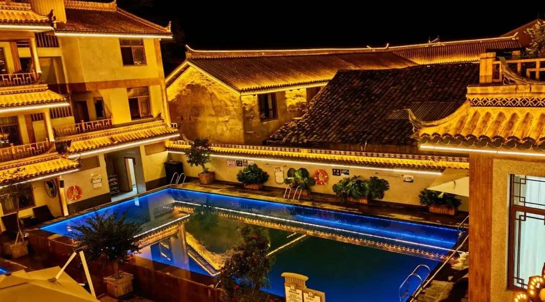 纸厂江边织女湖温泉康养度假村,建有民宿60间、客房41间,60间民宿分布于“星桥初见院”“云梭浣月院”“鹊语闲庭院”“耕烟织霞院”“星河寄远院”“锦书望夕院”“长信七夕院”等七个院落中,院内花木扶疏,茶香氤氲,置身其中,恍若踏入牛郎织女的浪漫叙事。庭院深处,一盏清茶、一卷诗书,便可消磨整个午后。夜幕降临,灯火点缀下的村落更显静谧温柔,繁星如碎银洒落天际,与湖光交相辉映,令人顿生“金风玉露一相逢,便胜却人间无数”之感。