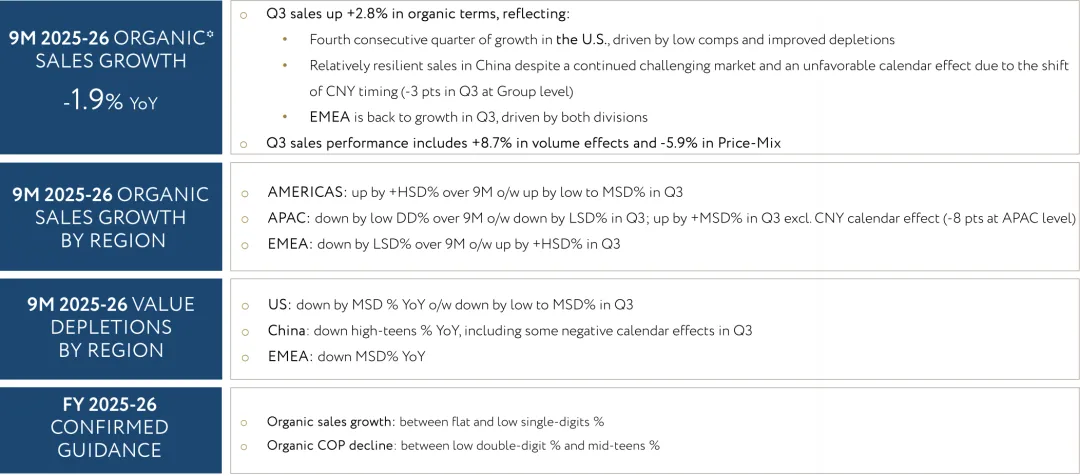 公司指出,尽管整体市场环境依然充满挑战,且中国春节时间调整带来不利的日历因素影响,第三季度中国市场销售表现仍展现出一定韧性,同比降幅维持在低双位数水平。与此同时,亚洲其他市场在该季度实现两位数增长,主要得益于人头马 VSOP 及路易十三的强劲表现。