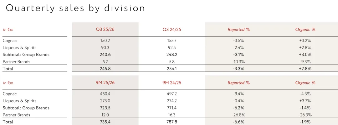 Please scrolldown for Englishversion全球领先烈酒集团人头马君度(Rémy Cointreau)公布其 2025–26 财年前九个月业绩表现。报告期内,集团实现销售额 7.354 亿欧元,按报告口径同比下降 6.6%,按可比口径(有机增长)同比下降 1.9%。