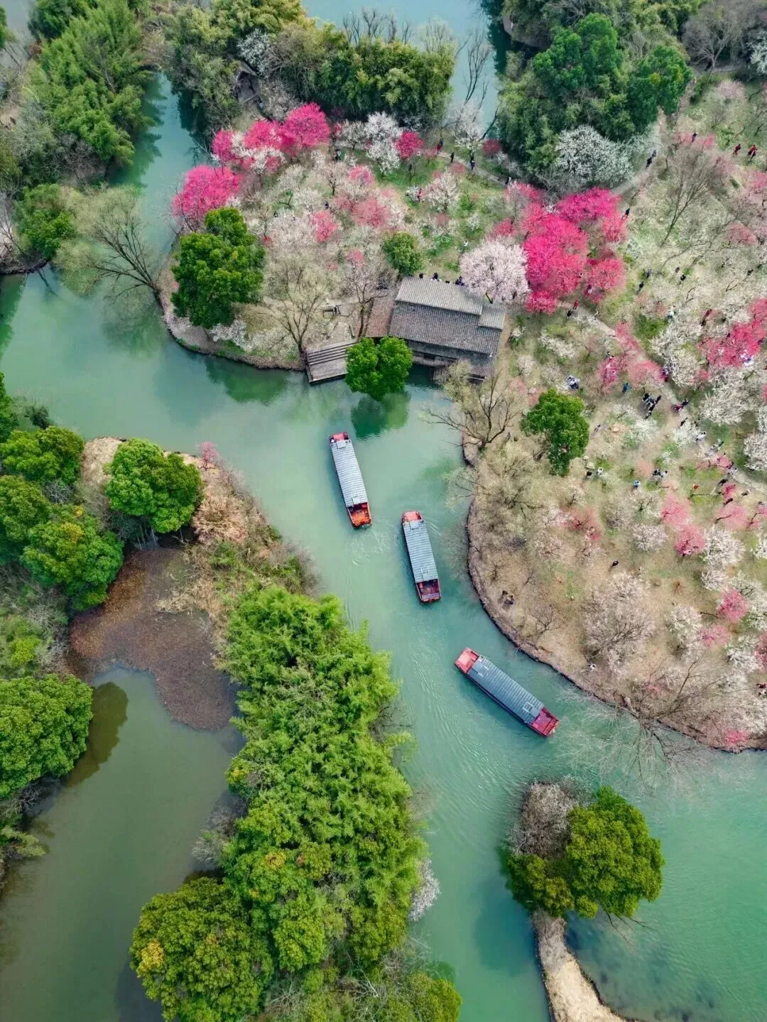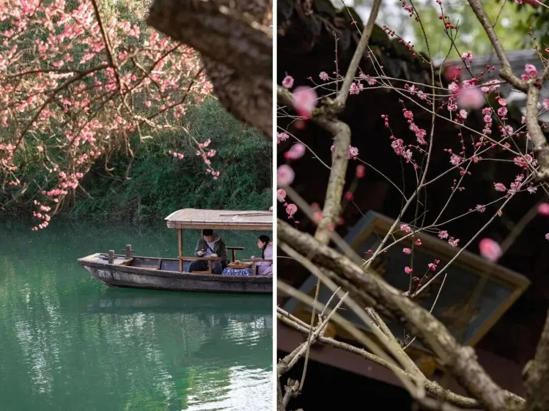 作为清代“西湖十八景”之一,“西溪探梅”的魅力在于 “水上探梅” 。乘坐摇橹船穿行于河道,看两岸 20000多株梅树 依水而立,花瓣轻落水面,充满野趣与诗意。