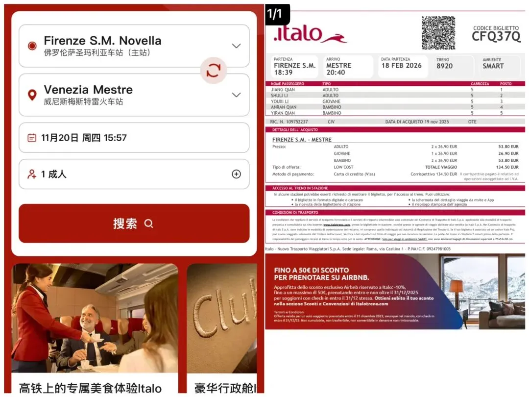 💜拿到签证赶紧订机票。然后订意大利国内行程的火车票。直接微信小程序搜“意大利italo高铁”,界面和携程预定火车票一样简单。全中文操作,付款后打印出来出发时出示就可以了,不用更换纸质车票。