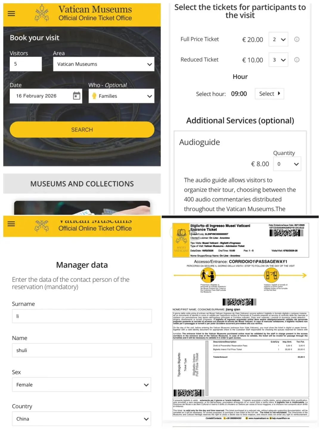 我就提前了三个月,结果我选的那天竟然已经有两个时间段售罄了,果然是世界的梵蒂冈…用手机操作比电脑快,点进去是意大利文,选择英文界面。按照步骤操作付款后在邮箱内打印出来。