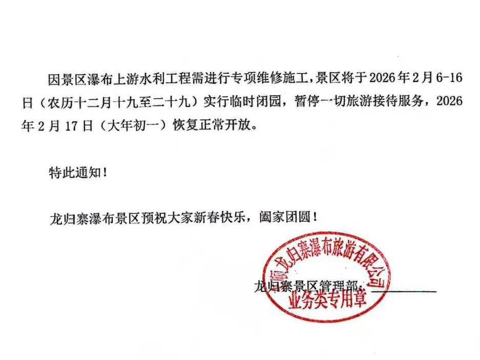 您现在的位置是:首页 > 国内旅游目的推荐 > 正文 国内旅游目的推荐 丰顺龙归寨景区临时闭园11天,恢复开放时间是… admin2026年02月04日 19:10:33国内旅游目的推荐10 丰顺龙归寨景区临时闭园11天,恢复开放时间是…↑ 服务丰顺人 ↑龙归寨景区将于2026年2月6-16日(农历十二月十九至二十九)实行临时闭园,暂停一切旅游接待服务,2026年2月17日(大年初一)恢复正常开放。来源:龙归寨景区;编辑:风铃↓点击【阅读原文】进入>>丰又顺长途 转载请说明来源于"旅荐网",部分内容转载自网络,如有侵权请联系qlwl@foxmail.com删除 本文地址:https://www.15386.cn/post/93756.html 上一篇 景区NPC:是流量密码还是运营“深坑”?利弊与收益全解析 下一篇 《西藏旅游行前会议》举行 相关文章 青海甘肃旅游小包团露营定制:个性化体验与行程规划解析 强推!清明出游指南:北京出发1-2天,这些宝藏地值得去 2026 洛阳赏花旅行攻略|牡丹花期全梳理 + 3 天路线,错过等一年 2025青岛清明出游指南:赏花、优惠、安全提示 新疆 伊犁花海七天六晚行程安排(伊宁、赛里木湖、精伊牧道、伊塞牧道、恰库牧道、萨哈野果林、吉尔格朗河) 山东省线上参团旅游 “避坑” 指南 核心解读|新版《旅游规划通则》核心要点与行业影响 龙城区4月招聘活动行程安排 3天“小长假”怎么玩?宝鸡最全旅游指南来了! 牛马一天的行程安排 发表评论 取消回复 评论列表 这篇文章还没有收到评论,赶紧来抢沙发吧~