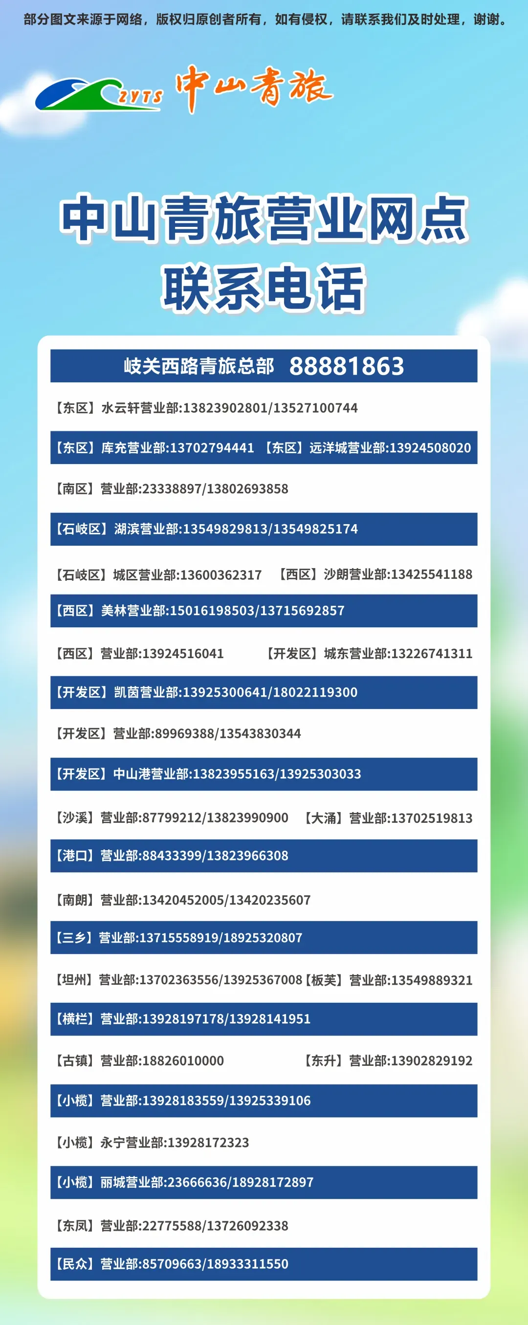1、我们致力于保护作者版权,不侵犯任何一方的合法权益,发布、转载或引用相关内容仅为了传播更多信息。2、此广告为要约邀请,所有图片、文字表述仅供参考,最终行程及价格以双方签订合同为准。3、最终解释权归【中山青旅】所有。