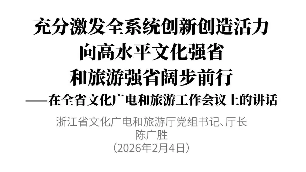 2月4日,全省文化广电和旅游工作会议在杭州召开,浙江省文化广电和旅游厅党组书记、厅长陈广胜出席会议并讲话,现刊发讲话全文。