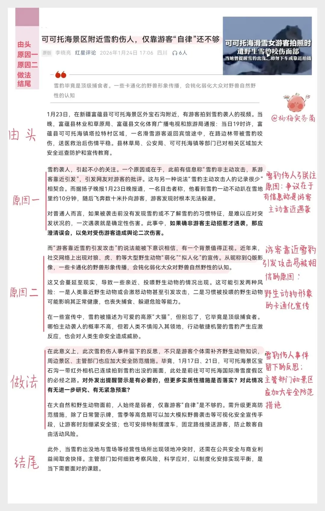 (一)由头:1月23日,在新疆富蕴县可可托海景区外宝石沟附近,有游客拍到雪豹袭人的视频。当晚,富蕴县林业和草原局、富蕴县文化体育广播电视和旅游局通报:当日19时许,富蕴县可可托海镇塔拉特村区域,一名滑雪游客返回宾馆途中,在路边林带被雪豹咬伤,送医救治后伤情平稳。县林草局、公安局、可可托海镇等部门已对相关区域加大安全巡查防护和宣传教育。