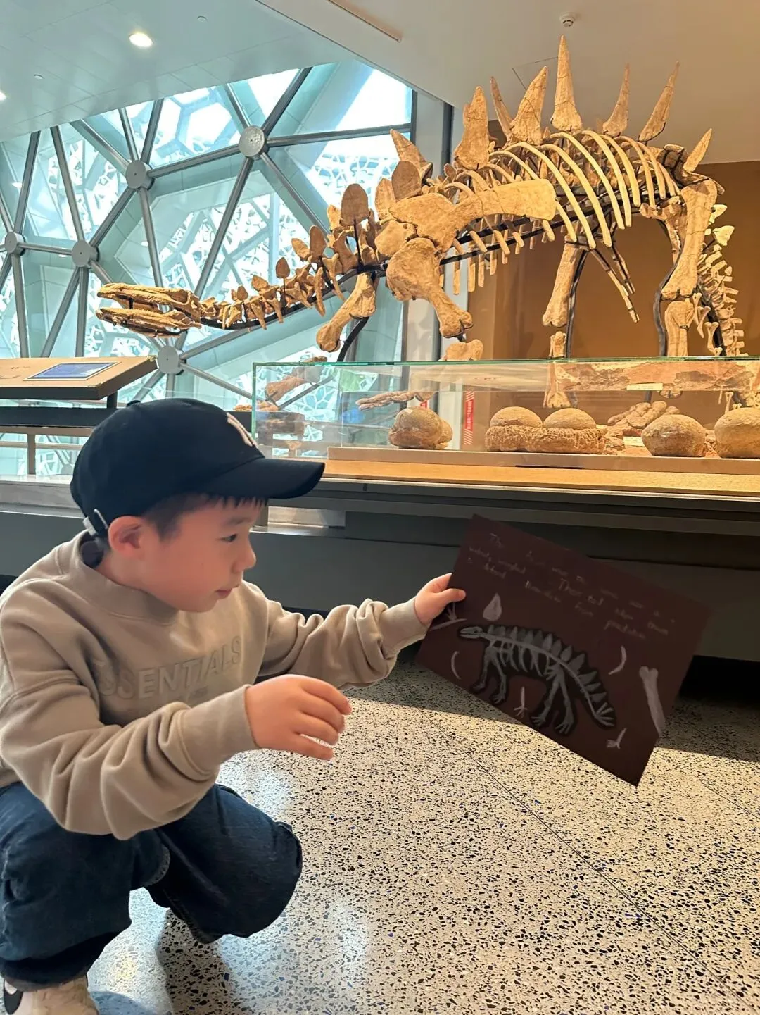 以前我带姐弟俩去这类地方,总会有点“备课”心态,提前看看路线、找找故事线索。他们也会兴致勃勃地带着自己画的恐龙去自然博物馆“认亲”。
