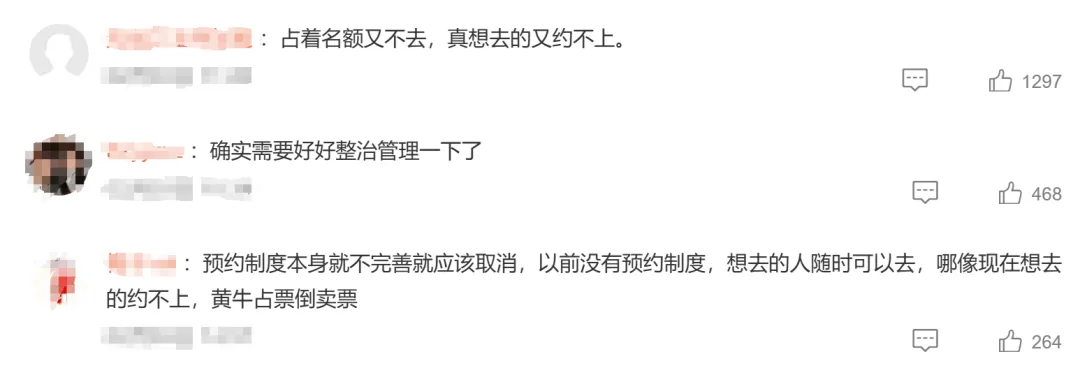 部分爽约者的心态是:反正不花钱,约了不去也没代价。景区免费预约制本意是提升效率与公平,但高频次的“预约爽约”行为本身却造成了新的资源浪费与机会不公。不少网友对此不忿↓