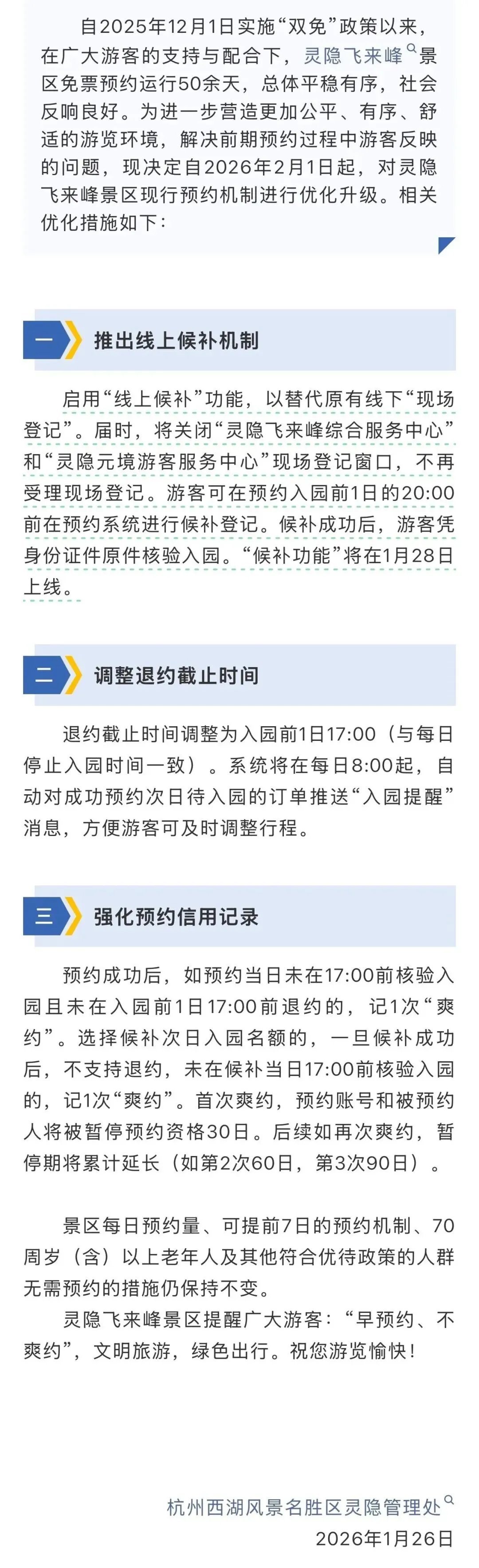 景区决定自2026年2月1日起,对现行的预约机制进行优化升级,全新推出“线上候补”功能,将被记录一次“爽约”,相关预约账号及账号所有人将面临30日的预约资格暂停。若再次发生爽约,暂停期将逐次延长,第二次为60日,第三次为90日。