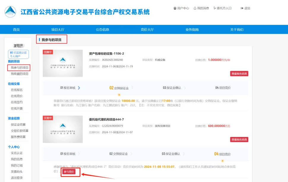 ①用户登录系统后,进入【用户中心-我的项目-我参与的项目】,进入竞价环节的项目会展示【参与竞价】按钮,点击【参与竞价】可进入项目竞价页面。