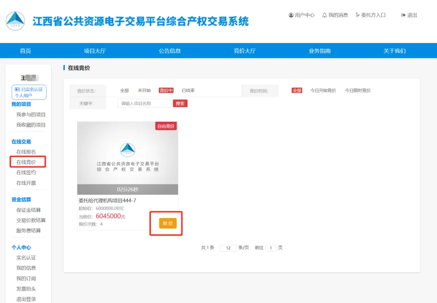 ②用户登录系统后,进入【用户中心-在线交易-在线竞价】,默认展示竞价中的项目,选择要报价的项目,点击【报价】可进入项目竞价页面。