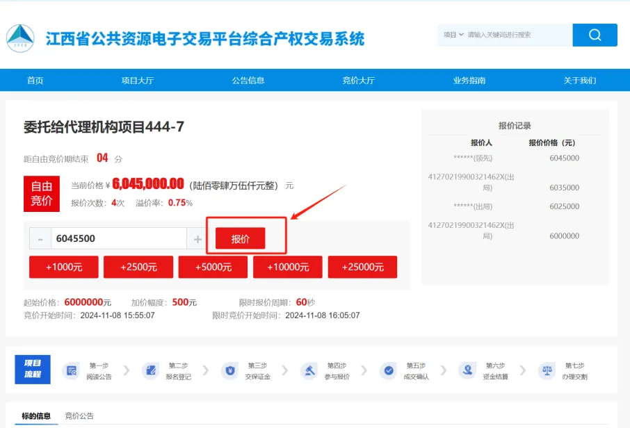 ①进入到项目竞价页面后,点击【报价】弹出报价确认框。(注意:第一个点击报价的竞买人报的是起始价格)